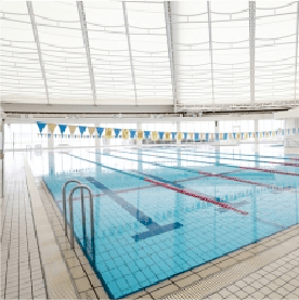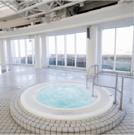 25m×6コースと、1周100mの流水プールで、目的・体力に合わせて安全に水中エクササイズを。歩行能力を維持する膝や股関節周囲の筋力アップに効果的なレッスンも盛りだくさん。