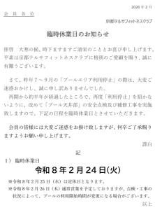 いつも京都テルサフィットネスクラブをご利用いただき、誠にありがとうございます。