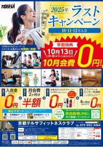 京都テルサフィットネスクラブでは、2025年の締めくくりにふさわしいラストキャンペーンを開催します!10月・11月・12月にご入会いただく方を対象に、今だけの早割特典&4大特典をご用意しました。ジム・プール・スタジオ・お風呂など、すべて使い放題の贅沢な環境で、新しいフィットネスライフを始めませんか?